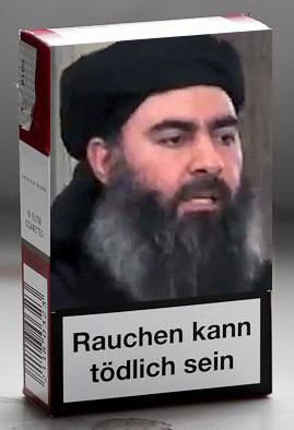 Da es nun in dieser Richtung keine investigativen Sensationen gibt, kümmern wir uns stattdessen um den wahren Grund, warum es jetzt die Schockbilder auf den Zigarettenschachteln gibt. Che Guevara ikonisiert auf der Zigarettenschachtel ist nur die Spitze des Eisbergs. Dieses Konzept hätte ja durchaus auch von Kreisen mit einem deutlich größeren Hang zum Märtyrertum aufgegriffen werden können. Das Ergebnis so einer Verschärfung ist rechts zu sehen. Gut, am Design müsste noch gearbeitet werden. Dass fast jedes Barthaar von Abu Bakr al-Baghdadi einzeln zu sehen ist, ist einfach zu viel Realismus, um die volle mythische Kraft dieser Bildsprache durschlagen zu lassen. Soweit wollte man es aber wohl gar nicht kommen lassen. Lieber gleich die Reißleine ziehen. "Die Texte müssen weg!" Man wollte sich wohl nicht darauf verlassen, dass diese IS Zigaretten immer zufällig mit dem Spruch